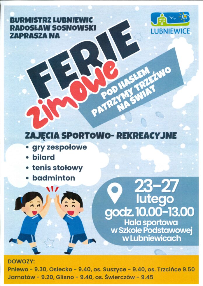 Strona główna Aktualności Zajęcia sportowo-rekreacyjne 23-27.02.2026 AktualnościOgłoszenia Zajęcia sportowo-rekreacyjne 23-27.02.2026 Przez Admin - 11 lutego 2026 18 0 Udostępnij na Facebooku Tweetnij na Twitterze PODOBNE ARTYKUŁYWIĘCEJ OD AUTORA Aktualności Zimowe ferie z naturą i kulturą Aktualności UWAGA!!! Aktualności UWAGA!!!